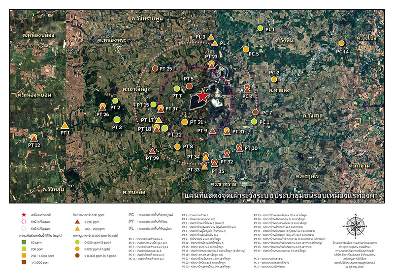 แผนที่แสดงจุดเฝ้าระวังระบบประปาชุมชนรอบเหมืองแร่ทองคำ