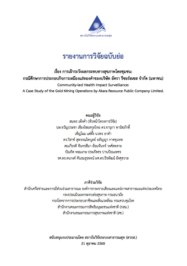 รายงานการวิจัยฉบับย่อเรื่อง การเฝ้าระวังผลกระทบทางสุขภาพโดยชุมชน: กรณีศึกษาการประกอบกิจการเหมืองแร่ทองคำของบริษัท อัครา รีซอร์สเซส จำกัด (มหาชน)