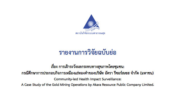 รายงานการวิจัยฉบับย่อเรื่อง การเฝ้าระวังผลกระทบทางสุขภาพโดยชุมชน: กรณีศึกษาการประกอบกิจการเหมืองแร่ทองคำของบริษัท อัครา รีซอร์สเซส จำกัด (มหาชน)